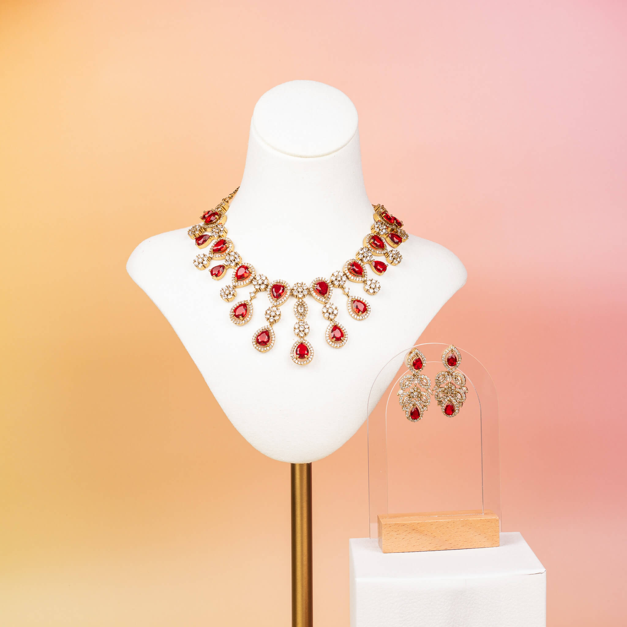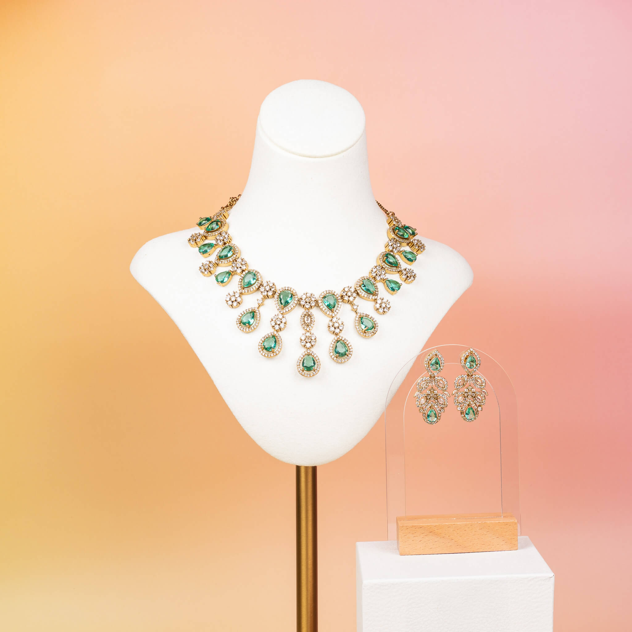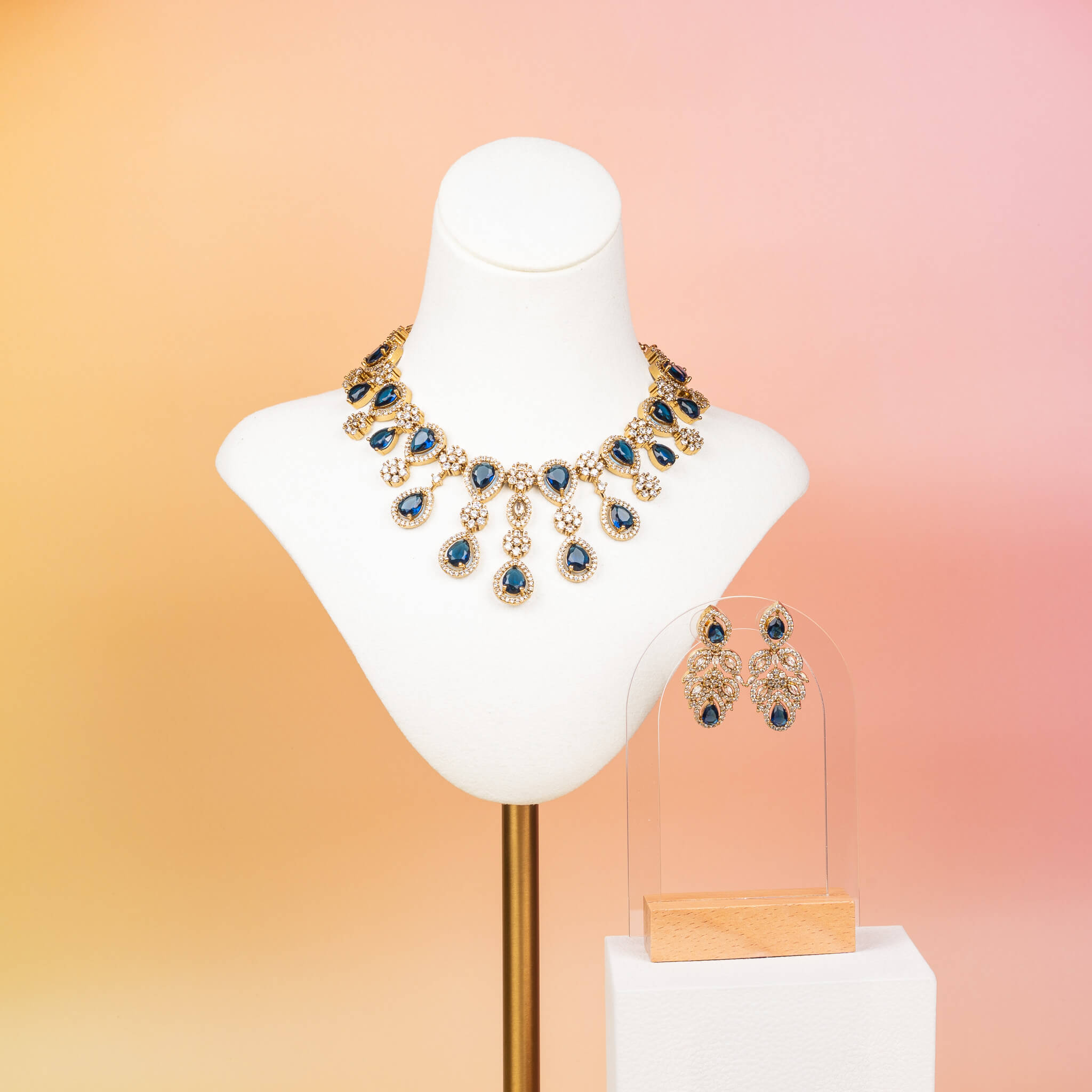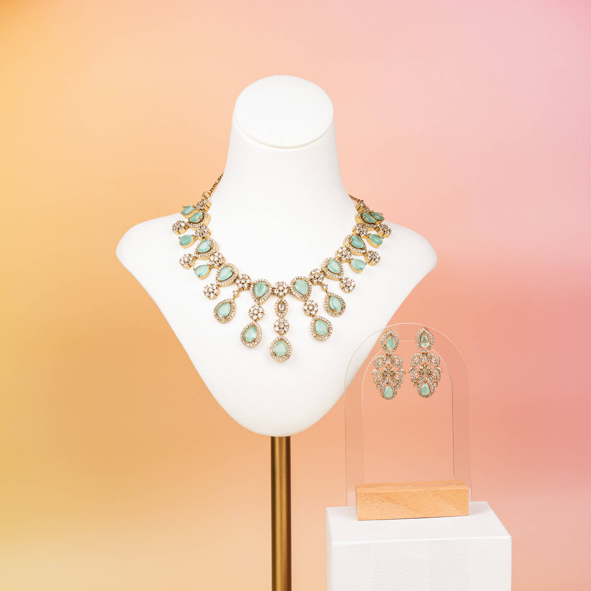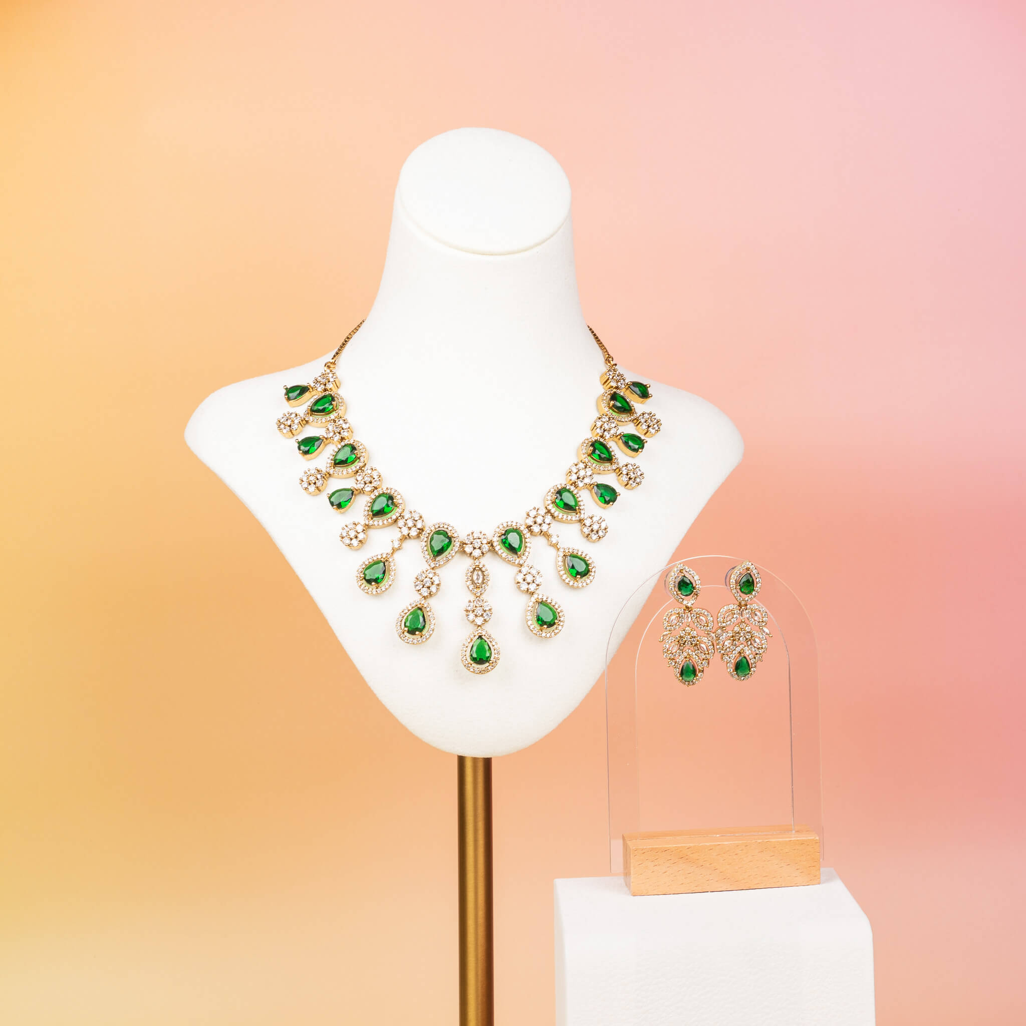 Make an entrance with Disha Gold, a stunning necklace and earring set handcrafted to perfection. Adorned with high-quality American Diamond (AD) stones and elegant teardrop elements, this set brings a regal finish to any look. Despite its opulent design, Disha Gold is lightweight and comfortable to wear – ideal for weddings, festive celebrations, or glamorous evenings. Available in a variety of breathtaking colors to complement your style.